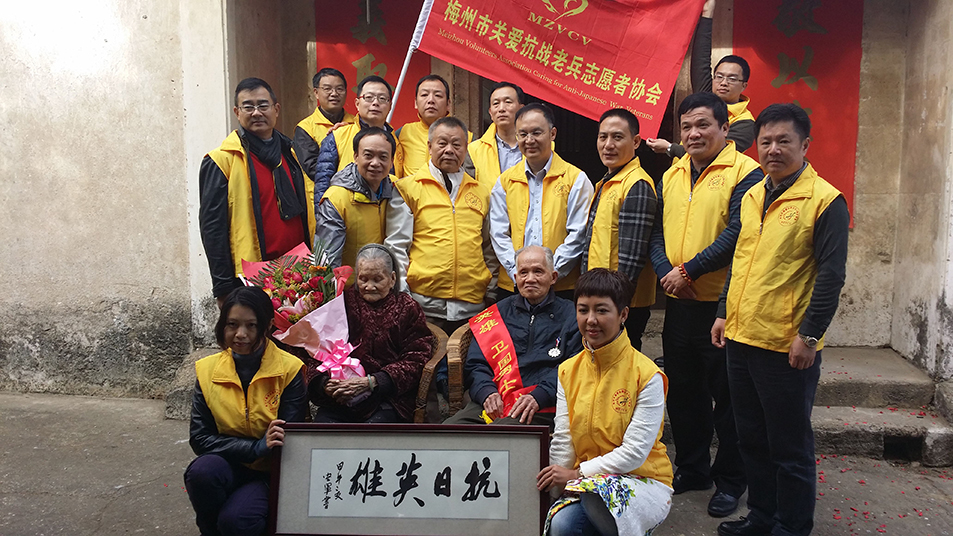 梅州市关爱抗战老兵志愿者协会成立后,大力开展寻访散居梅州山乡的抗战老兵,为寻访到的每位抗战老兵举行民间简朴又庄重的“赠章授荣”仪式、为困难老兵提供基本生活保障、为抗战老兵提供日常生活照顾、为老兵过生日、重大节日慰问、生病看望看护、为抗战老兵留影留声、留手印,归队致以哀荣等等关爱活动,以热心和诚心,为抗战老兵送去“迟到的荣誉”和慰藉。经协会理事会研究,决定对抗战老兵进行日常关爱的同时,给幸存抗战老兵每月500元的致敬金。通过发放关爱金和致敬金,使老兵每月能获得1100元的生活保障。2014年9月至2018年5月,广东省雁洋公益基金会发放叶剑英基金关爱金380多万元,协会动员社会各界热心人士和志愿者38600多人次,行程逾10万公里,为抗战老兵发放致敬金及其它慰问金等700多万元,为抗战老兵发放御寒物资一大批、保健品和日常生活用品、慰问品一大批,为住院就医的抗战老兵送上慰问金和轮值守护陪伴,累计为300多位梅州抗战老兵及老兵遗孀,广东以外800多位抗战老兵及老兵遗孀送上了最真挚的关怀。